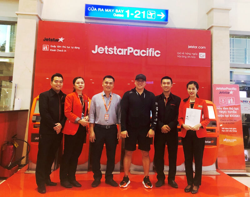 Ông Randy T (áo đen, đứng giữa) chụp ảnh kỷ niệm với nhân viên Jetstar Pacific sau khi nhận lại ba lô và đầy đủ số tiền bỏ quên