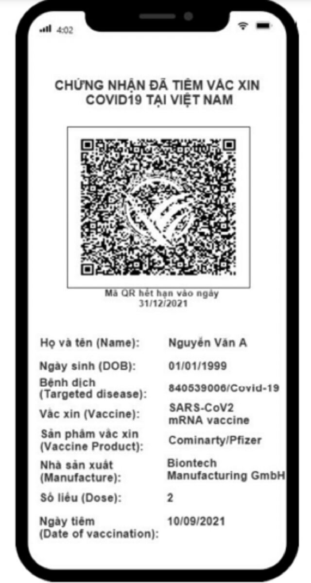 Bộ Y tế vừa ban hành Quyết đinh số 5772/QĐ-BYT về biểu mẫu và quy trình cấp Hộ chiếu vắc xin cho người đã tiêm đủ 2 mũi với 8 loại vắc xin đã được Bộ Y tế cấp phép. Chứng nhận "Hộ chiếu vắc xin" được cấp sử dụng định dạng mã QR, hết hạn sau 12 tháng kể từ ngày mã QR này được khởi tạo.