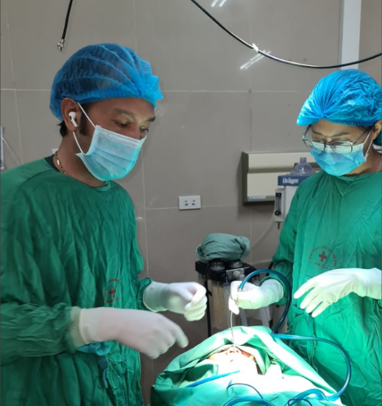 BSCKII. Phùng Đăng Khoa (bên trái) và đồng nghiệp phẫu thuật thành công ca bệnh nặng.