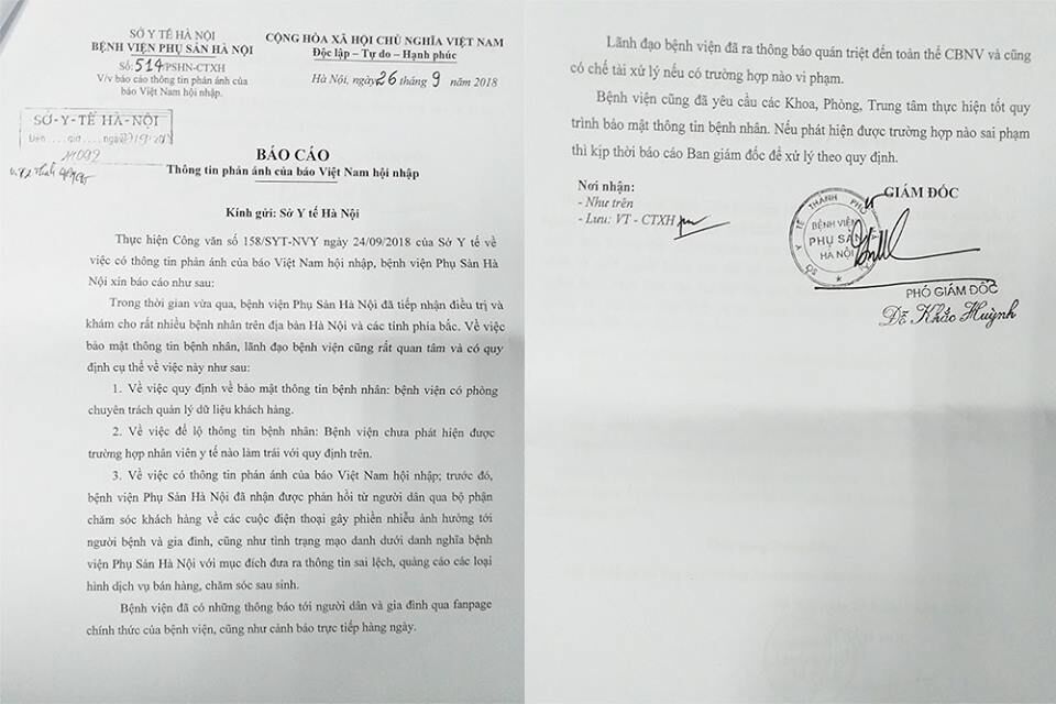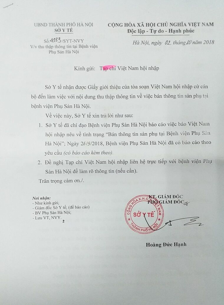 Sau khi vào cuộc thông tin, PV Việt Nam Hội nhập điện tử đã phản ánh nội dung kể trên đến Sở Y tế Hà Nội. Tiếp nhận thông tin PV phản ánh tới, ngày 02/10/2018 Sở Y tế Hà Nội đã có văn bản số: 4333/SYT-NVY trả lời cho cơ quan ngôn luận về quá trình xác minh thông tin báo chí phản ánh, kèm theo đó là những văn bản báo cáo giải trình của phía lãnh đạo bệnh viện Phụ sản Hà Nội. Ngoài ra, trong văn bản của Sở Y tế Hà Nội cũng có nêu: Đề nghị cơ quan báo chí liên hệ trực tiếp với bệnh viện Phụ sản Hà Nội để làm rõ thông tin (nếu cần).