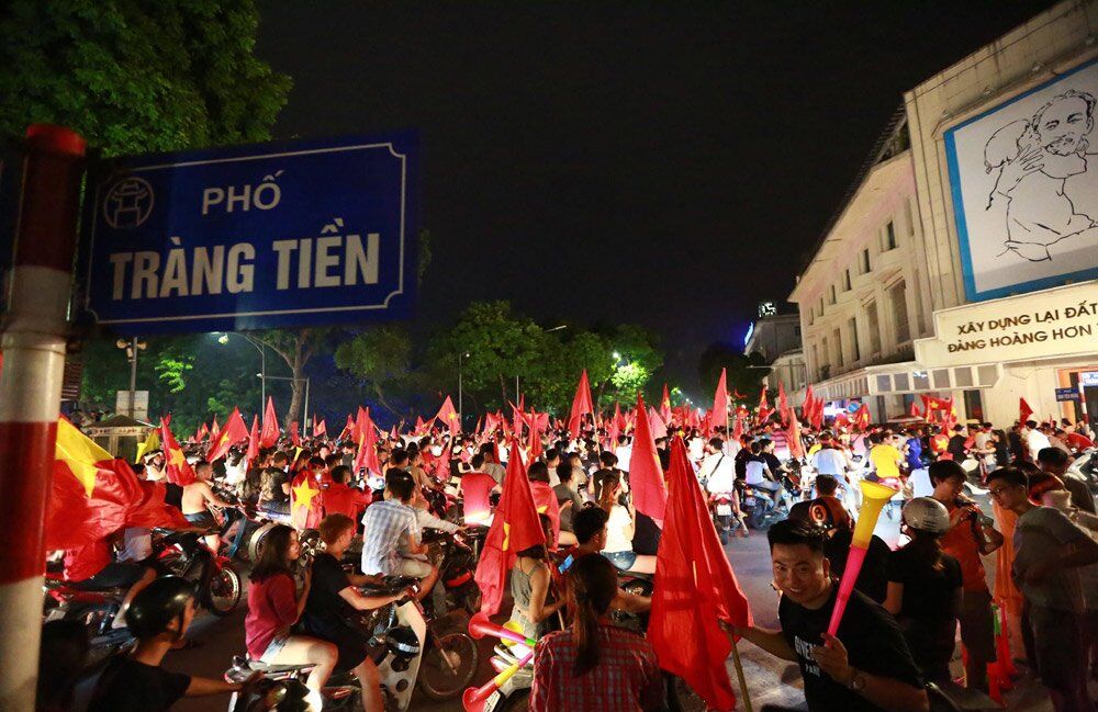 Hà Nội: Không khí náo nhiệt vẫn chưa lắng xuống. Hàng đoàn xe vẫn rầm rầm nối đuôi nhau chạy khắp các phố quanh khu vực hồ Gươm. Cờ đỏ sao vàng và những tiếng hò reo vẫn từng bừng trên khắp các con phố.