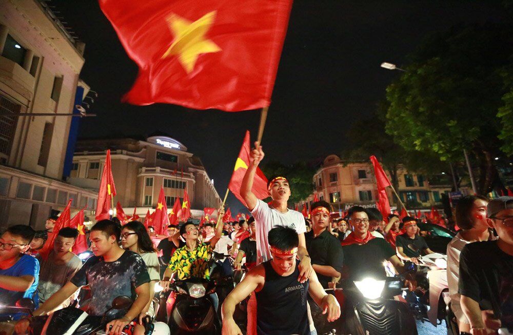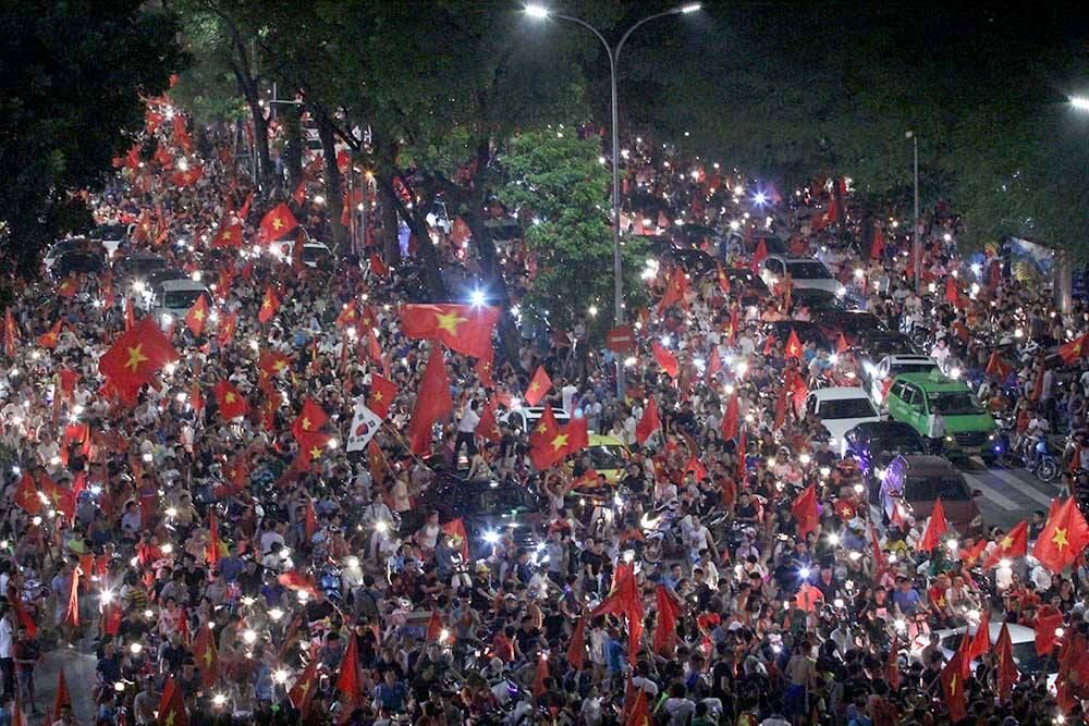 VNHNO - Hàng trăm nghìn cổ động viên mặc áo cờ đỏ sao vàng, cầm cờ, đánh trống, khua chiêng bắt đầu xuống đường ăn mừng chiến thắng của U23 Việt Nam.