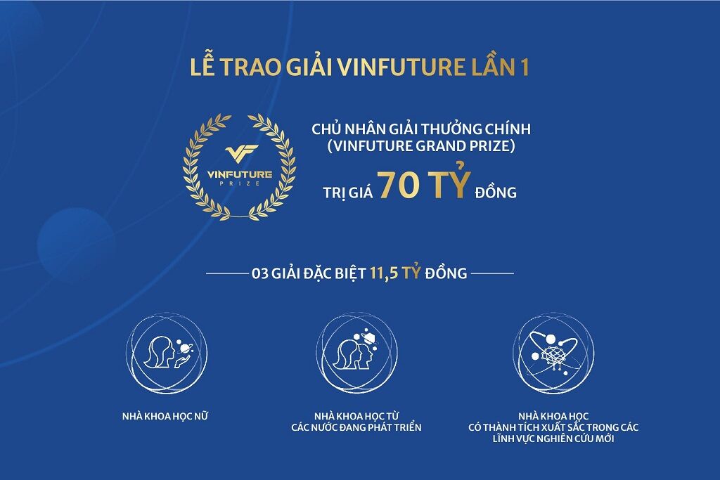Hệ thống giải thưởng gồm có Giải thưởng Chính (VinFuture Grand Prize) trị giá 3 triệu USD là một trong các giải thưởng thường niên có giá trị lớn nhất từ trước đến nay trên toàn cầu; 3 Giải Đặc biệt, mỗi giải trị giá 500 nghìn USD, dành cho các nhà khoa học nữ, các nhà khoa học đến từ các nước đang phát triển và các nhà khoa học nghiên cứu các lĩnh vực mới.