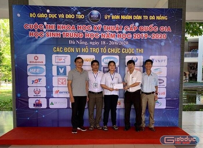 Em Phạm Thị Thùy Trang cùng thầy Cao Ngọc Sơn (thứ hai bên trái sang) tại cuộc thi Khoa học kỹ thuật Quốc gia năm học 2019-2020 (Ảnh: Nhân vật cung cấp).