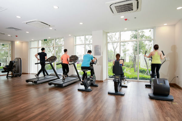 Phòng tập Gym hiện đại, hướng ra không gian xanh.