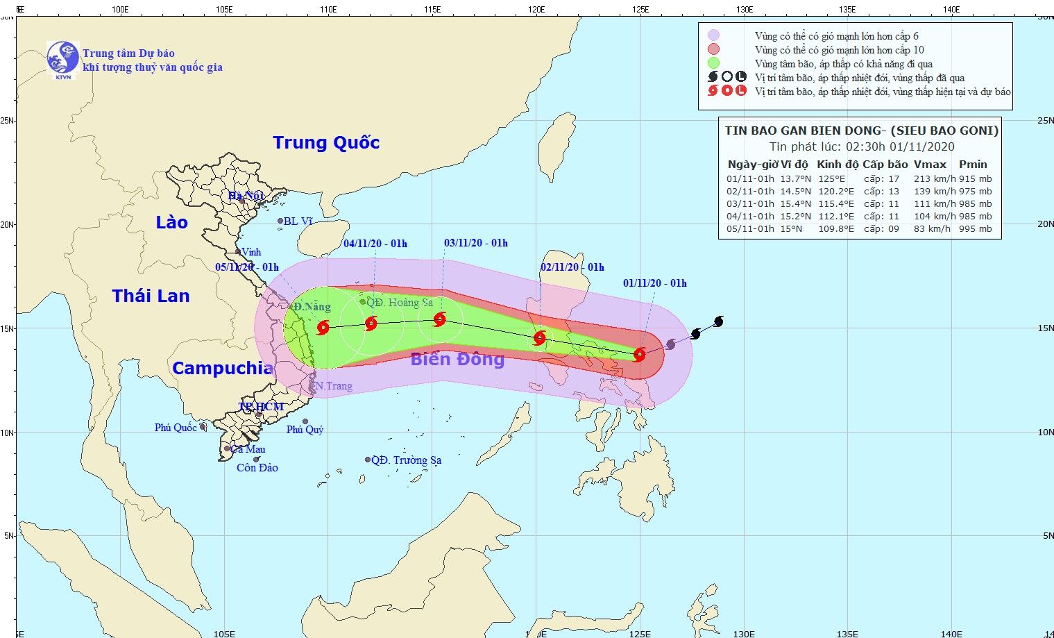Hồi 07 giờ ngày 01/11, vị trí tâm bão ở khoảng 13,5 độ Vĩ Bắc; 123,6 độ Kinh Đông, trên khu vực miền Trung Philippines. Sức gió mạnh nhất vùng gần tâm bão mạnh cấp 15 (165-185km/giờ), giật cấp 17.