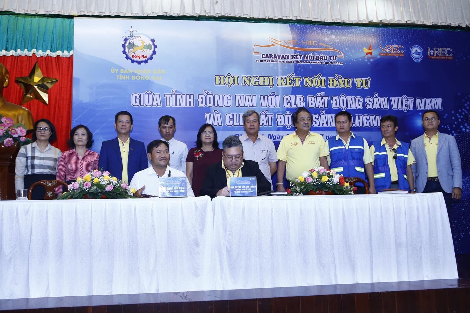 Ông Huỳnh Tấn Gia Thạnh - Phó Chủ tịch VREC và HREC cùng ông Đặng Văn Điềm - Chủ tịch Hội Doanh nhân trẻ tỉnh Đồng Nai ký kết "Biên bản ghi nhớ hợp tác" dưới sự chứng kiến của Lãnh đạo UBND tỉnh Đồng Nai và Chủ tịch VREC, HREC cùng các thành viên trong BCH.