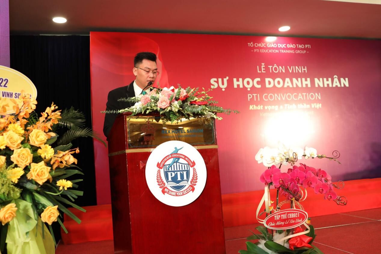 CEO Nguyễn Duy Hưng - Lớp trưởng của lớp CEO 66 vinh dự đại diện cho các anh chị học viên phát biểu cảm tưởng trong lễ tôn vinh sự học của Doanh nhân PTI Tp.HCM.