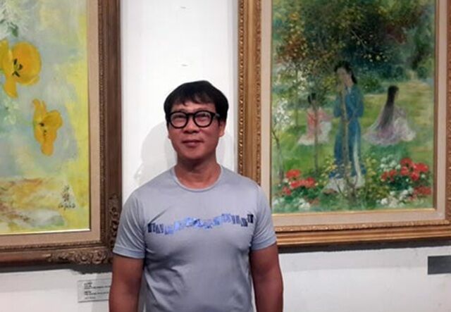 Nhà sưu tầm Nguyễn Minh bên những bức tranh của họa sĩ Vũ Cao Đàm
