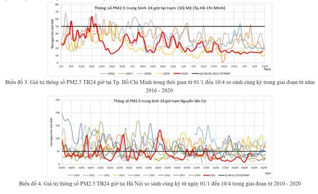So sánh diễn biến chất lượng không khí từ ngày 1/1 đến 10/4 với cùng kỳ của những năm trước đó cho thấy chất lượng không khí có xu hướng được cải thiện hơn. Tuy nhiên, trong thời gian từ tháng Một đến nửa đầu tháng Ba, giá trị thông số bụi mịn PM2.5 có thấp hơn những năm trước đó nhưng không rõ rệt. Trong khi đó, từ thời gian nửa cuối tháng Ba cho đến nay, nhất là thời gian thực hiện cách ly xã hội, chất lượng không khí tại các đô thị tốt hơn so tháng Một và tháng Hai.
