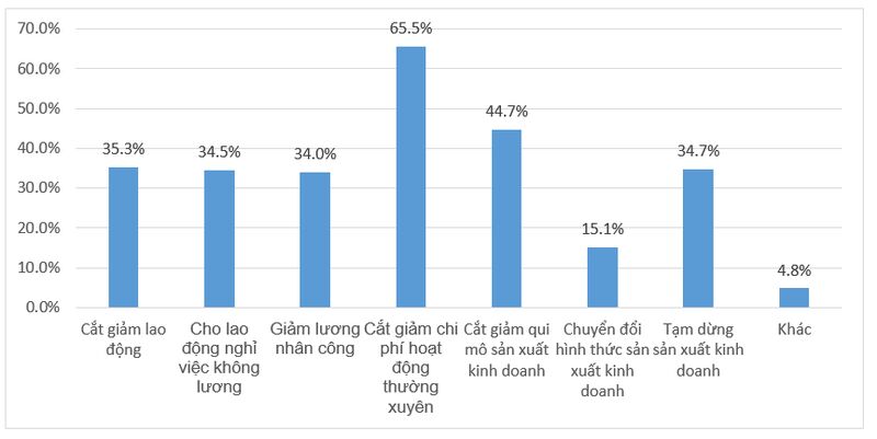 Cụ thể, 65,5% DN thực hiện cắt giảm chi phí hoạt động thường xuyên; 35,3% DN phải cắt giảm lao động; 34% DN phải cắt giảm lương nhân công lao động; 44,7% DN cắt giảm quy mô sản xuất kinh doanh; 34,7% DN lựa chọn tạm ngừng hoạt động sản xuất kinh doanh để chờ qua thời kỳ khó khăn; 15,1% DN thực hiện chuyển đổi hình thức sản xuất kinh doanh cho phù hợp với bối cảnh mới.