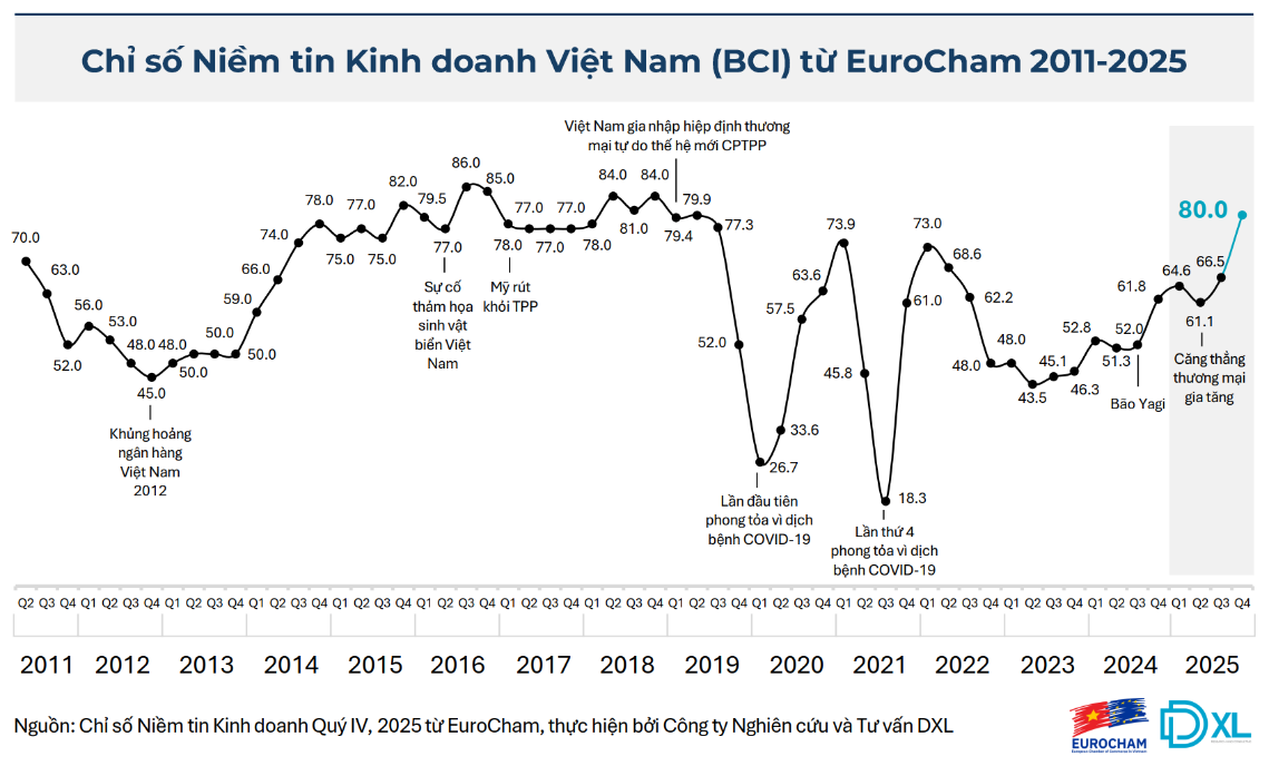Với 80 điểm trong quý IV/2025, Chỉ số Niềm tin kinh doanh EuroCham ghi nhận mức cao nhất trong 7 năm