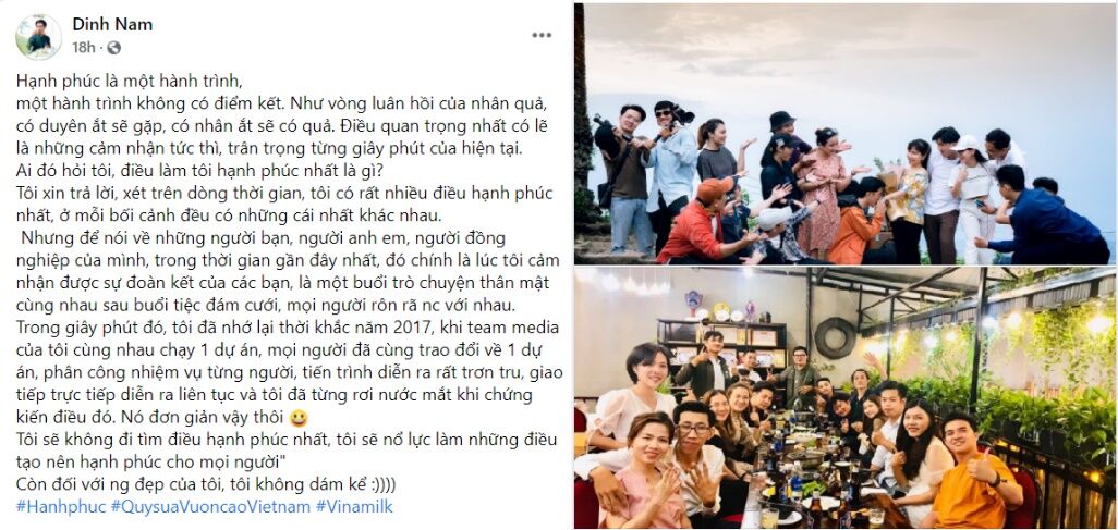 Nếu như với Facebooker Giang Phan (Hà Nội), hạnh phúc là một hành trình chứ không phải đích đến bởi được đi, được trải nghiệm, được khám phá những điều bất ngờ, ngạc nhiên trên quãng đường mà cô đã đi qua, thì với Đình Nam, chàng trai trẻ làm trong lĩnh vực sáng tạo tại Đà Nẵng, những phút giây ngồi cạnh đồng nghiệp, bạn bè, hoặc giúp mọi người lưu lại những khoảnh khắc hồ hởi, gắn kết trong từng khung ảnh của mình, tất cả đều là niềm hạnh phúc bình dị mà Nam vô cùng trân quý.