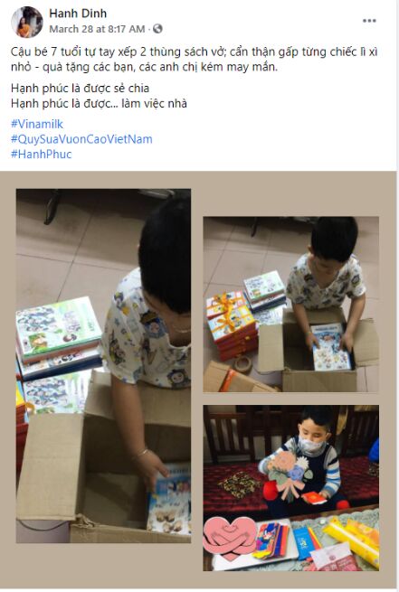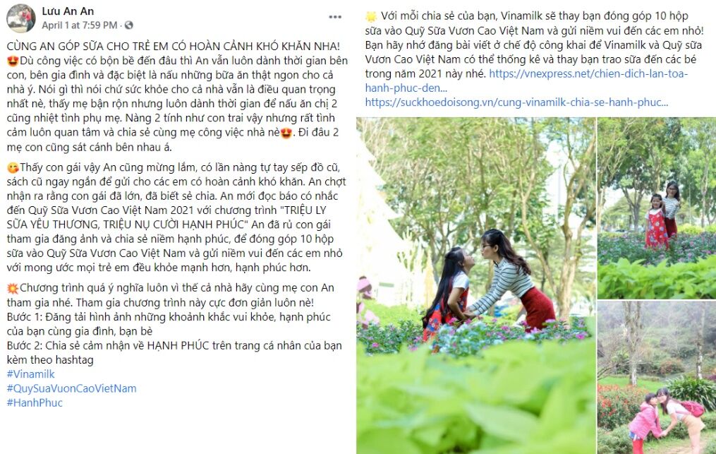 Chiến dịch vẫn tiếp tục đến 15/4/2021, với mỗi chia sẻ được đăng tải, bạn sẽ cùng Vinamilk gửi 10 hộp sữa đến các em nhỏ kém may mắn.
