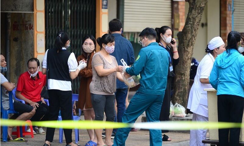 Cung cấp nhu yếu phẩm miễn phí cho các hộ dân phải cách ly ở phường Trúc Bạch. Ảnh: vov.vn