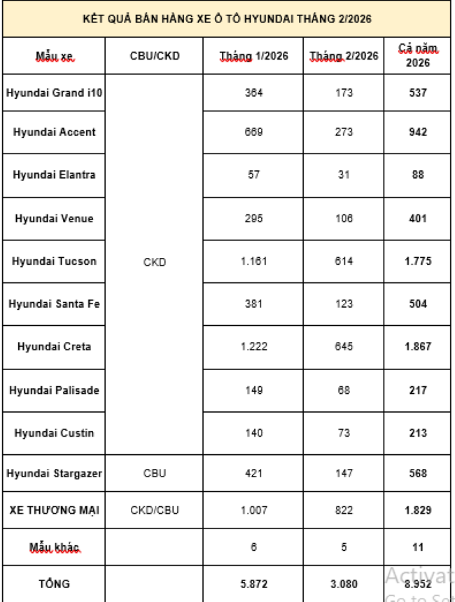 Doanh số bán hàng các mẫu xe Hyundai trong tháng 2/2026 (Đơn vị: Xe)