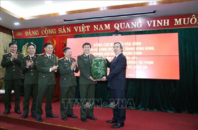 Đồng chí Nguyễn Văn Bình tặng quà cho Ban lãnh đạo Cục An ninh mạng và Phòng chống tội phạm sử dụng công nghệ cao- Ảnh: TTXVN