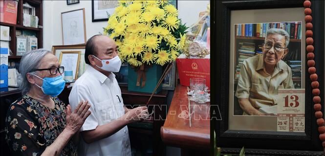 Chủ tịch nước Nguyễn Xuân Phúc đến nhà riêng, thắp hương tưởng nhớ nhà báo Hữu Thọ, nguyên Trưởng ban Tư tưởng - Văn hóa Trung ương (1995 - 2001); nguyên Tổng Biên tập Báo Nhân Dân. Ảnh: TTXVN