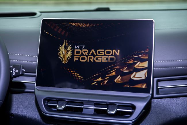 Màn hình trong xe VF 7 Hỏa Long Độc Bản có hình nền rồng lửa phá cách.