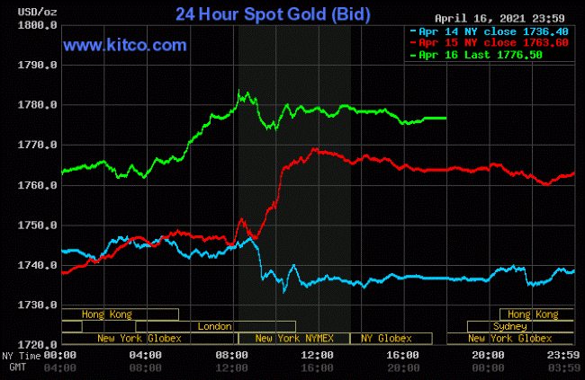 Trong phiên giao dịch hôm qua (ngày 17.4 theo giờ Việt Nam), xu hướng tăng mạnh của giá vàng thế giới tiếp tục được duy trì ổn định từ vùng 1.760 USD lên 1.776 USD/ounce. Theo đó đóng cửa phiên giao dịch cuối tuần, giá vàng chinh phục thành công mức giá 1.776,5 USD/ounce, đạt mức tăng 32,5 USD mỗi ounce so với giá mở cửa đầu tuần.