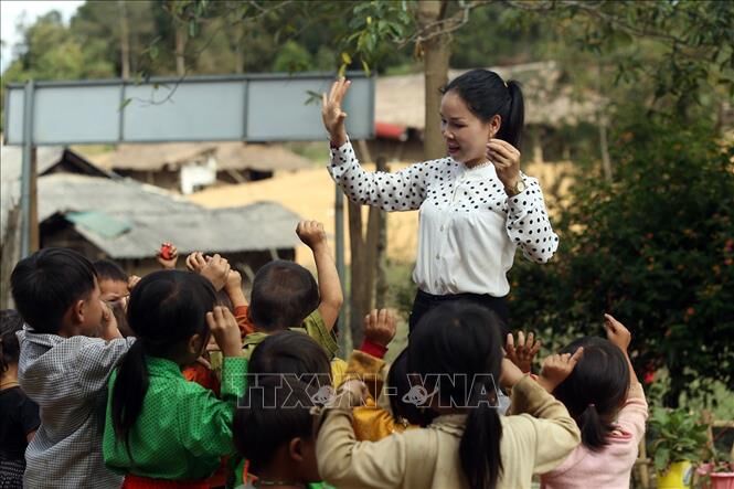 Cô Miên dạy cho các em nhỏ trường Mầm non số 2 Mường Mươn. Ảnh: Phan Tuấn Anh/TTXVN.