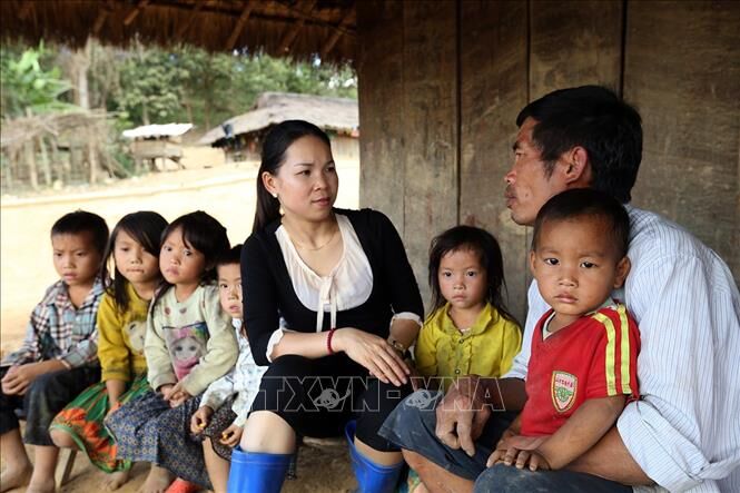Cô Miên đến từng nhà động viên bố mẹ các em đưa con tới trường. Ảnh: Phan Tuấn Anh/TTXVN.