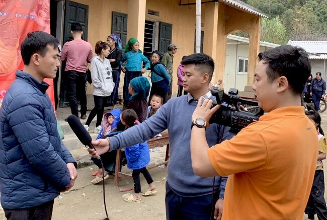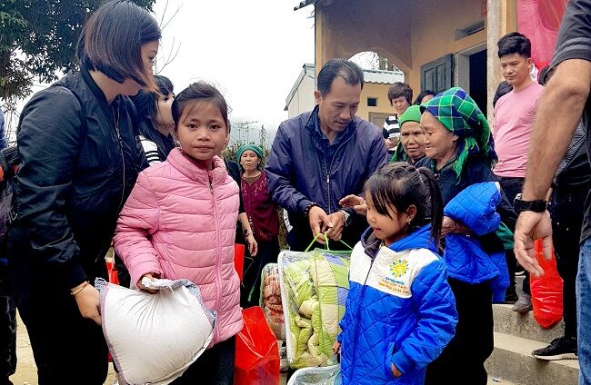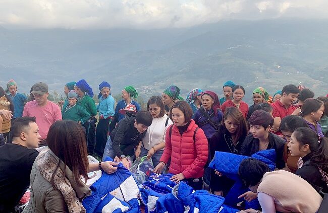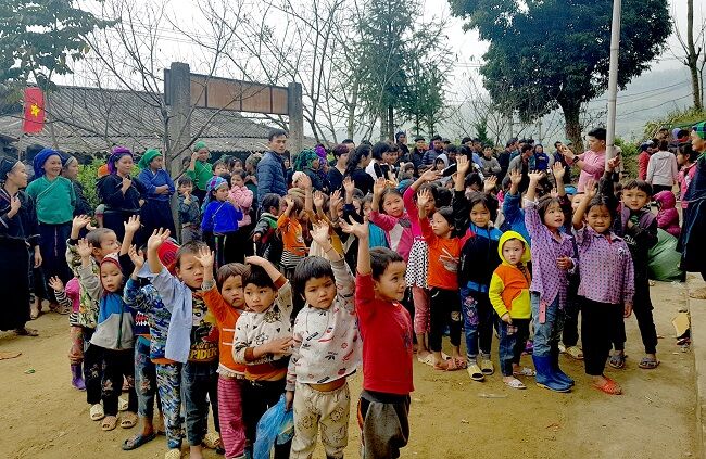 Lên đến nơi, không ai bảo ai, mọi người trong đoàn lại chia quà vào những chiếc túi và trao tận tay cho các em học sinh. Từng chiếc áo được mặc cho các em, từng đôi ủng cũng được mọi người hướng dẫn các em đi vào ngay tại sân trường. Nhiều em chân quá nhỏ, hoặc quá to, các thành viên đều lựa chọn và kịp thời đổi kích cỡ để các em có được đồ dùng vừa vặn nhất. Còn những vật dụng, lương thực khác như chăn, gạo, mỳ tôm… cũng được chuyển tới tận tay phụ huynh các em học sinh.