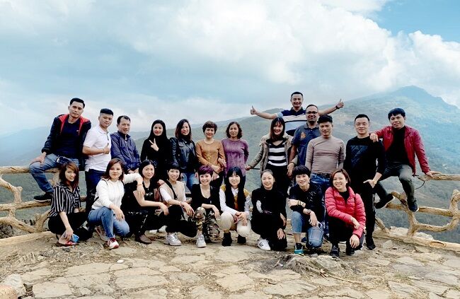 Các thành viên trong đoàn công tác thiện nguyện Hoa Mặt Trời chụp ảnh lưu niệm tại Xín Mần, Hà Giang