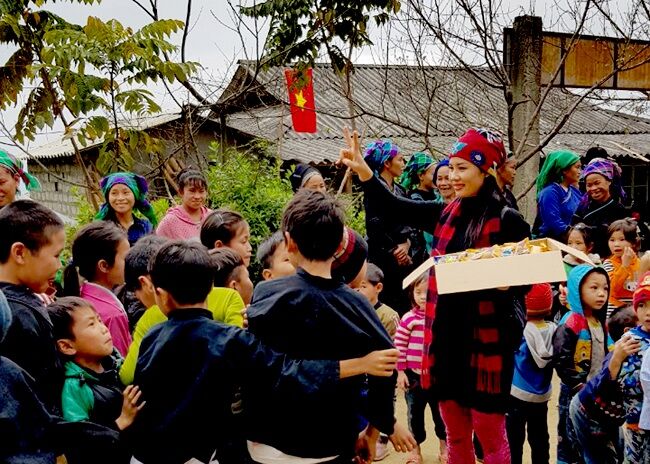 Chị Lê Thu Hồng - Chủ nhiệm CLB Thiện nguyện Hoa Mặt Trời tặng bánh kẹo cho các em nhỏ tại Hồ Thầu
