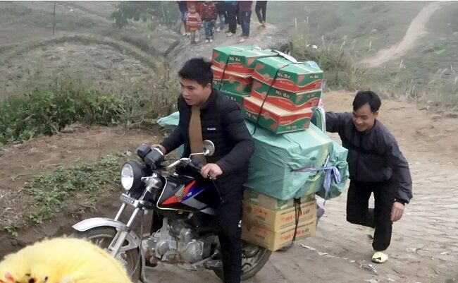Người dân địa phương giúp đoàn vận chuyển quà lên điểm trường Pạc Thảy
