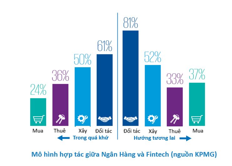 Trong báo cáo “Định hình tương lai: Cách thức các định chế tài chính đang áp dụng Fintech để tiến hóa và phát triển” của KPMG, khảo sát 160 tổ chức tài chính trên 36 quốc gia, các ngân hàng trả lời phỏng vấn đã thực hiện các chiến lược với Fintech: mua lại, thuê, tự xây dựng và hợp tác. Trong đó, 81% trong tổng số ngân hàng được khảo sát thiên về mô hình hợp tác trong hiện tại và tương lai, tăng 20% so với trong quá khứ (61%) (xem hình bên dưới).