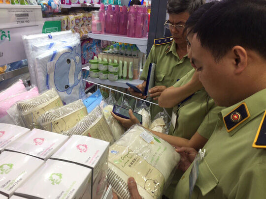 Ảnh : Lực lượng Quản lý thị trường TP Hồ Chí Minh kiểm tra tem mác hàng hóa tại hệ thống siêu thị Con Cưng