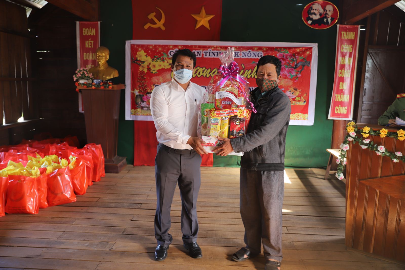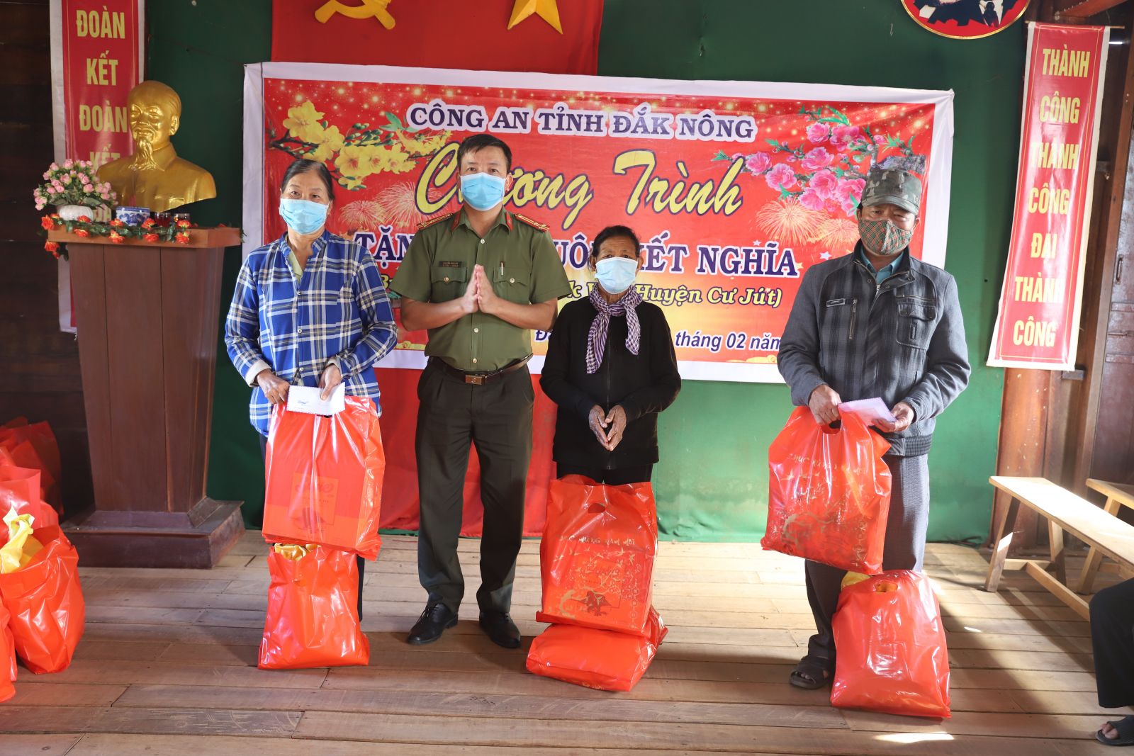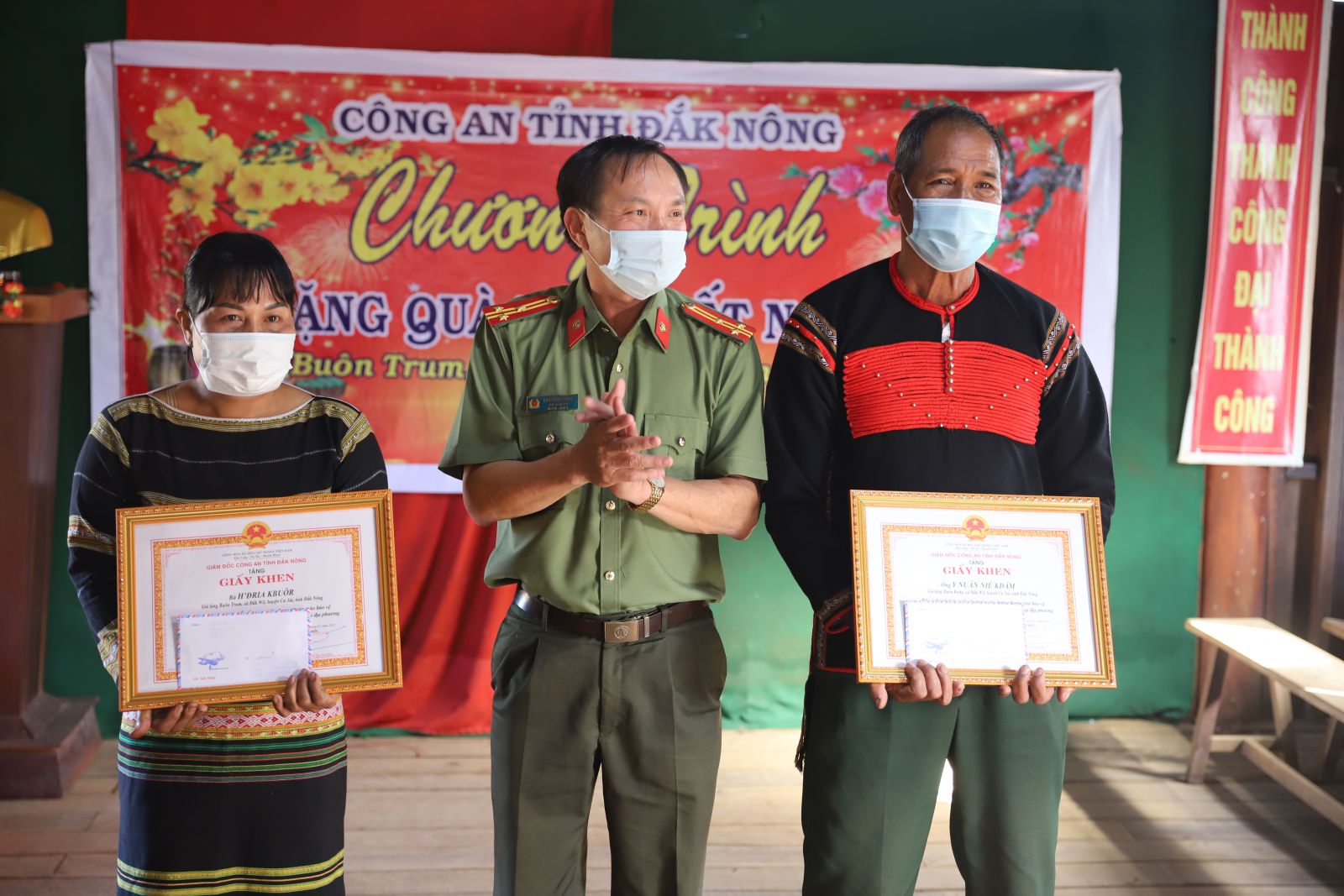 Nhân dịp này, Thượng tá Nay Gia Phú – Phó Giám đốc Công an tỉnh đã trao tặng quà và gửi lời chúc Tết đến tất cả bà con nhân dân trong buôn đón một năm mới vui tươi, an toàn, lành mạnh và đoàn kết, tương thân tương ái để xây dựng buôn làng ngày càng ấm no, hạnh phúc và an ninh, an toàn; đại diện Công an tỉnh cũng đã trao giấy khen của Giám đốc Công an tỉnh cho bà H’Đria Kbuôr, già làng Buôn Trum và ông Y Nuăn Niê Kdăm, già làng Buôn Knha, xã Đắk Wil, huyện Cư Jút vì đã có thành tích xuất sắc trong xây dựng phong trào bảo vệ ANTQ, góp phần bảo đảm ANTT tại địa phương. Đồng thời trao tặng 22 phần quà (mỗi phần quà trị giá 500.000đ) cho các hộ gia đình chính sách, già làng, người có uy tín và các hộ gia đình có hoàn cảnh khó khăn trên địa bàn Buôn Trum.