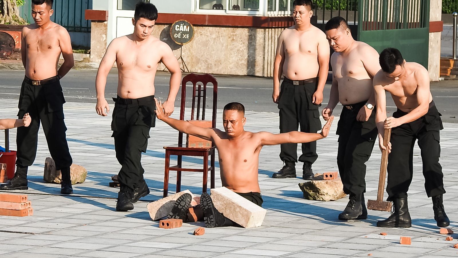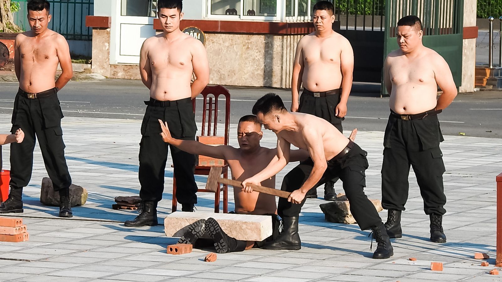 Một màn diễn tập khí công nội phá, các chiến sĩ phải chịu sức nặng của những vật thể rắn tác động lên cơ thể