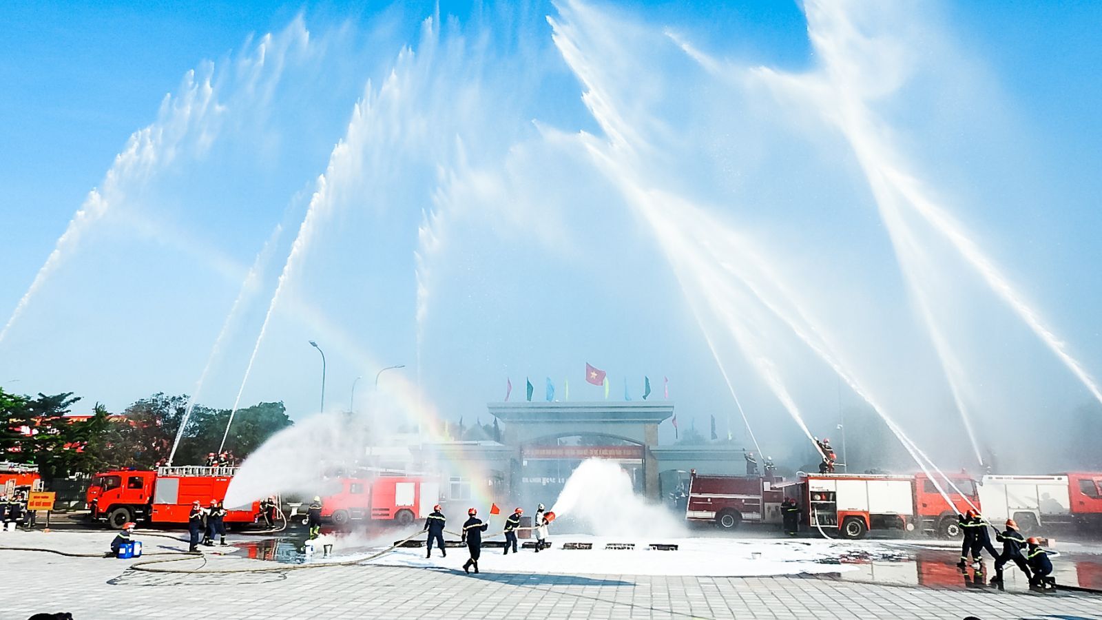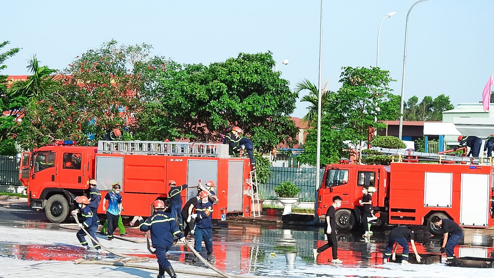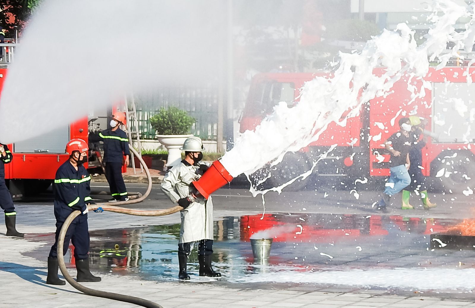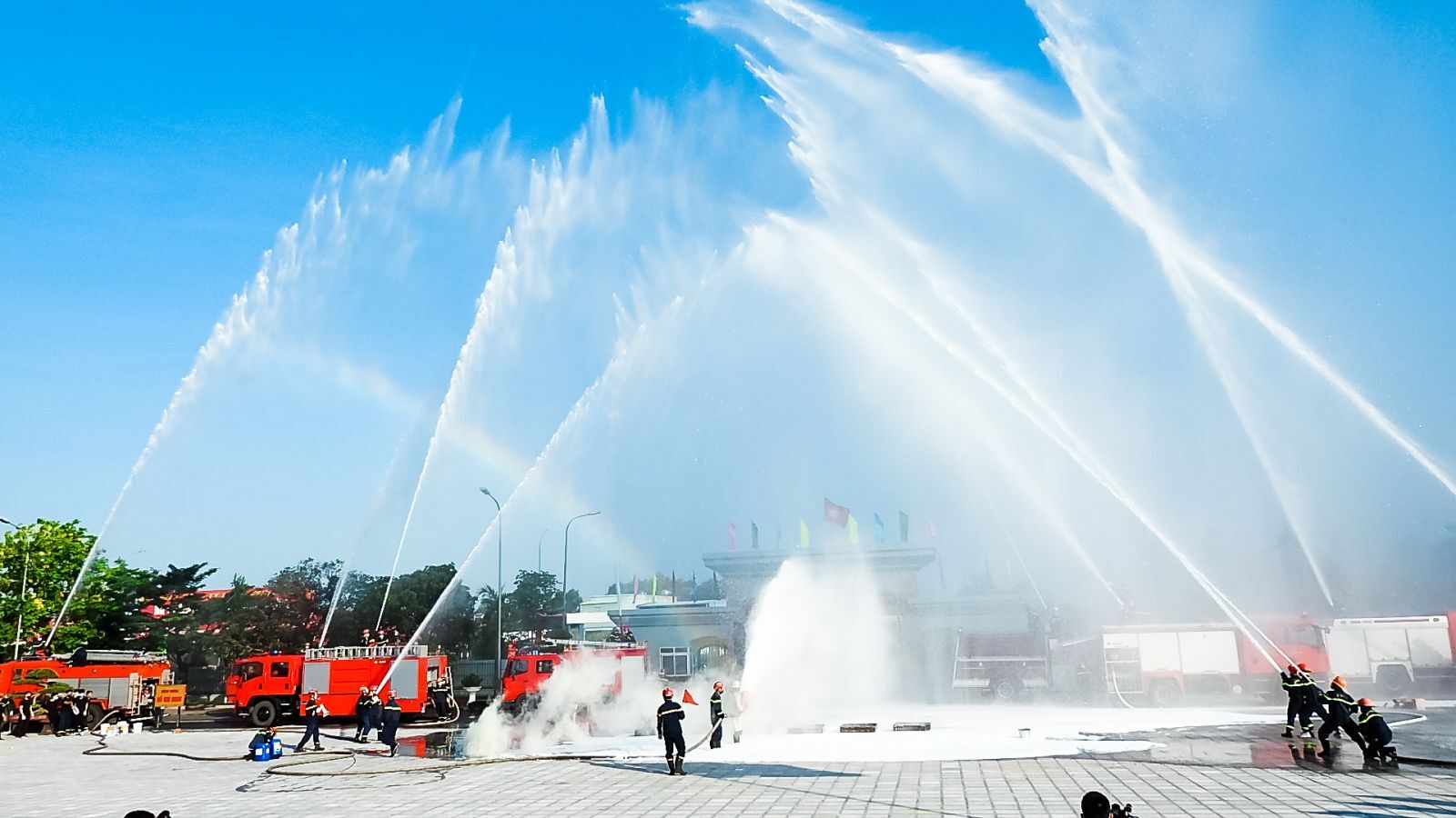 Nhiều xe chữa cháy hiện đại đồng loạt phun nước, nhanh chóng dập tắt đám cháy