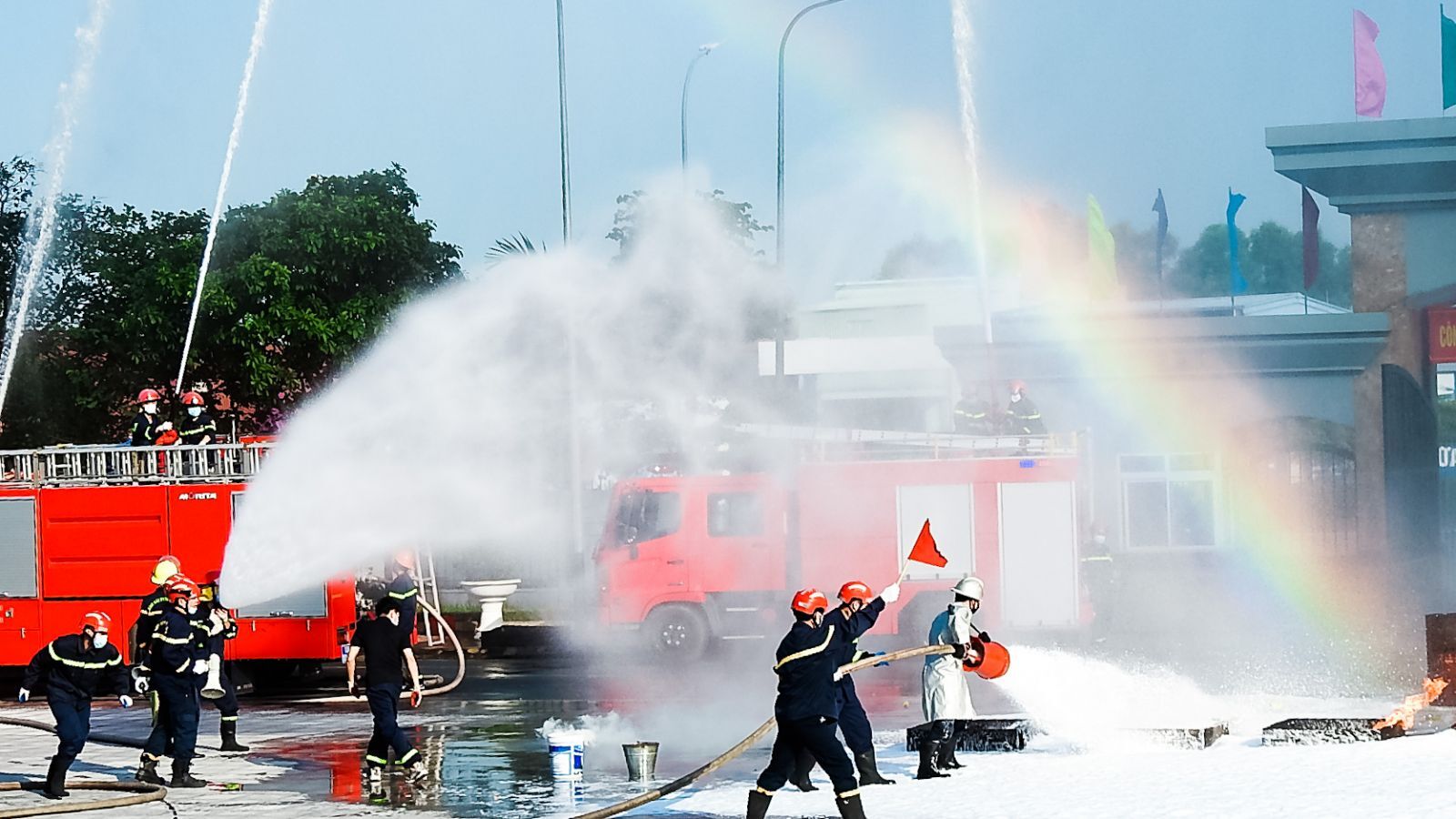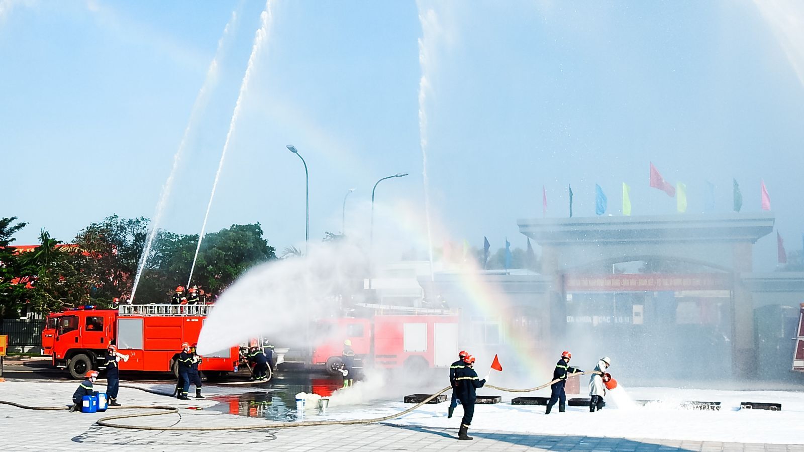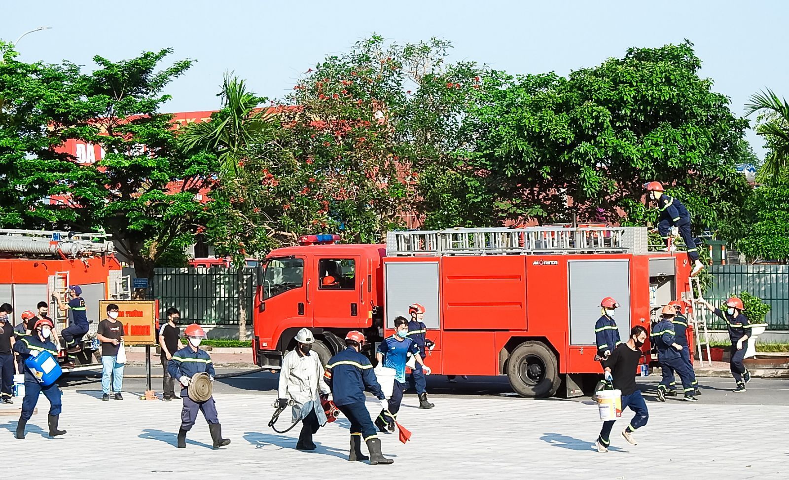 Nhiều xe chữa cháy hiện đại đồng loạt phun nước, nhanh chóng dập tắt đám cháy