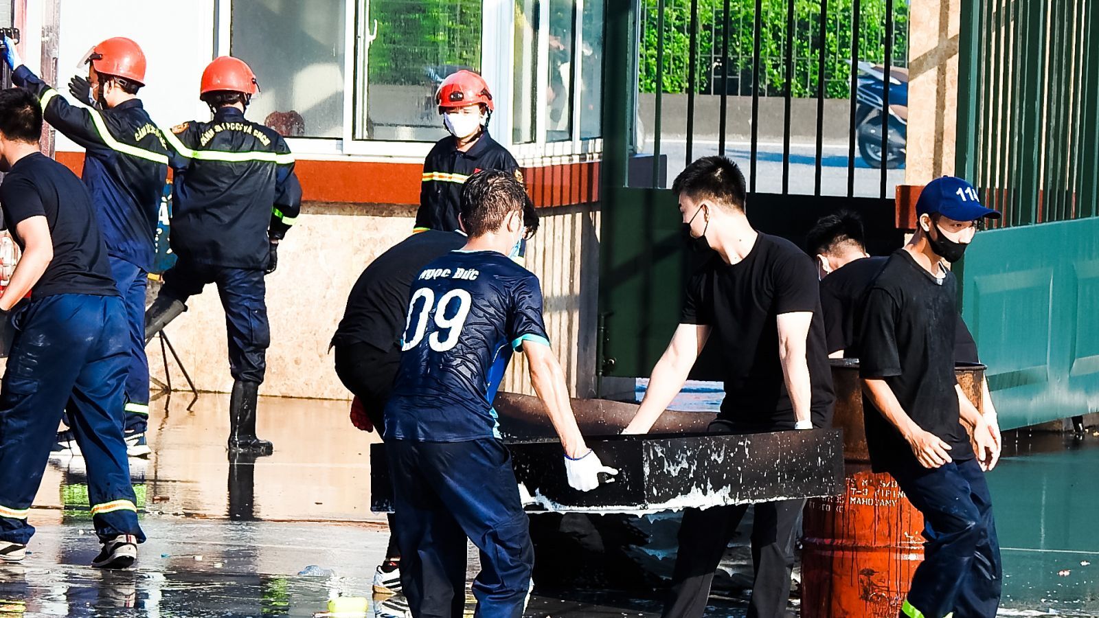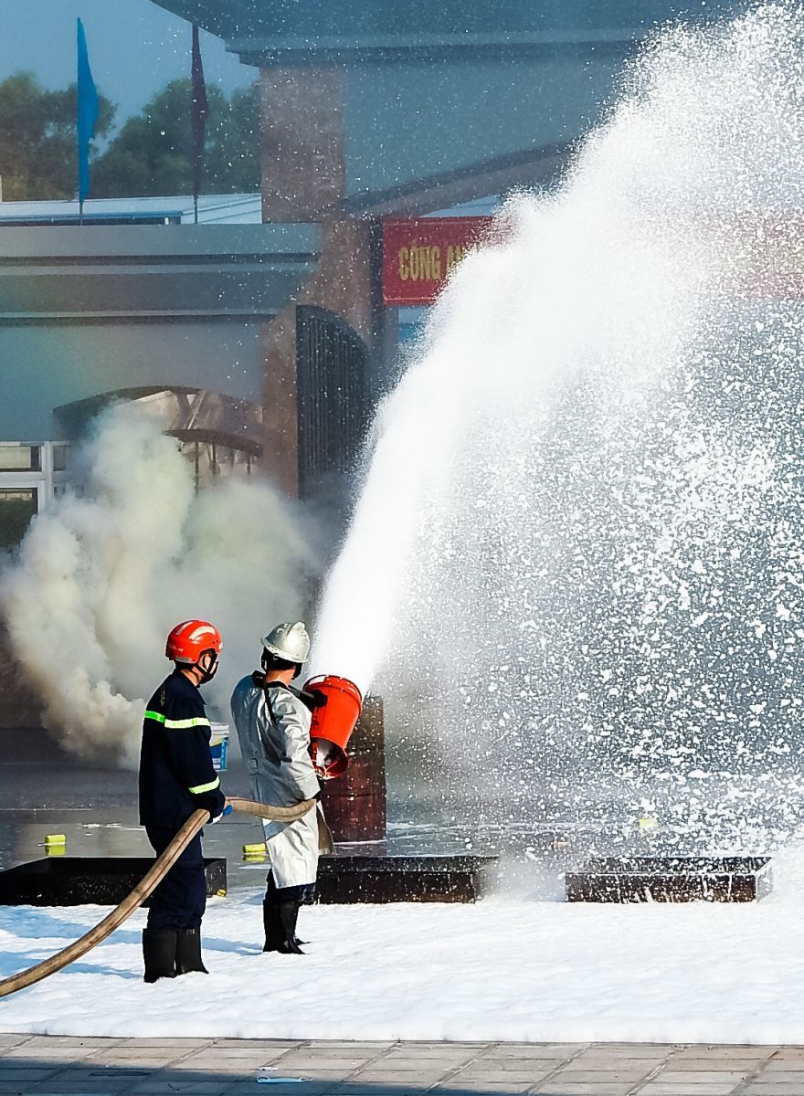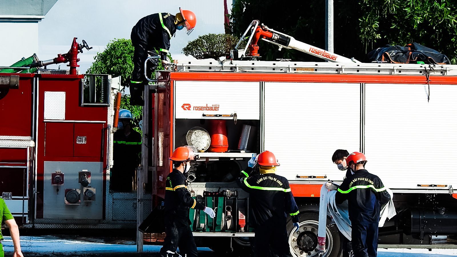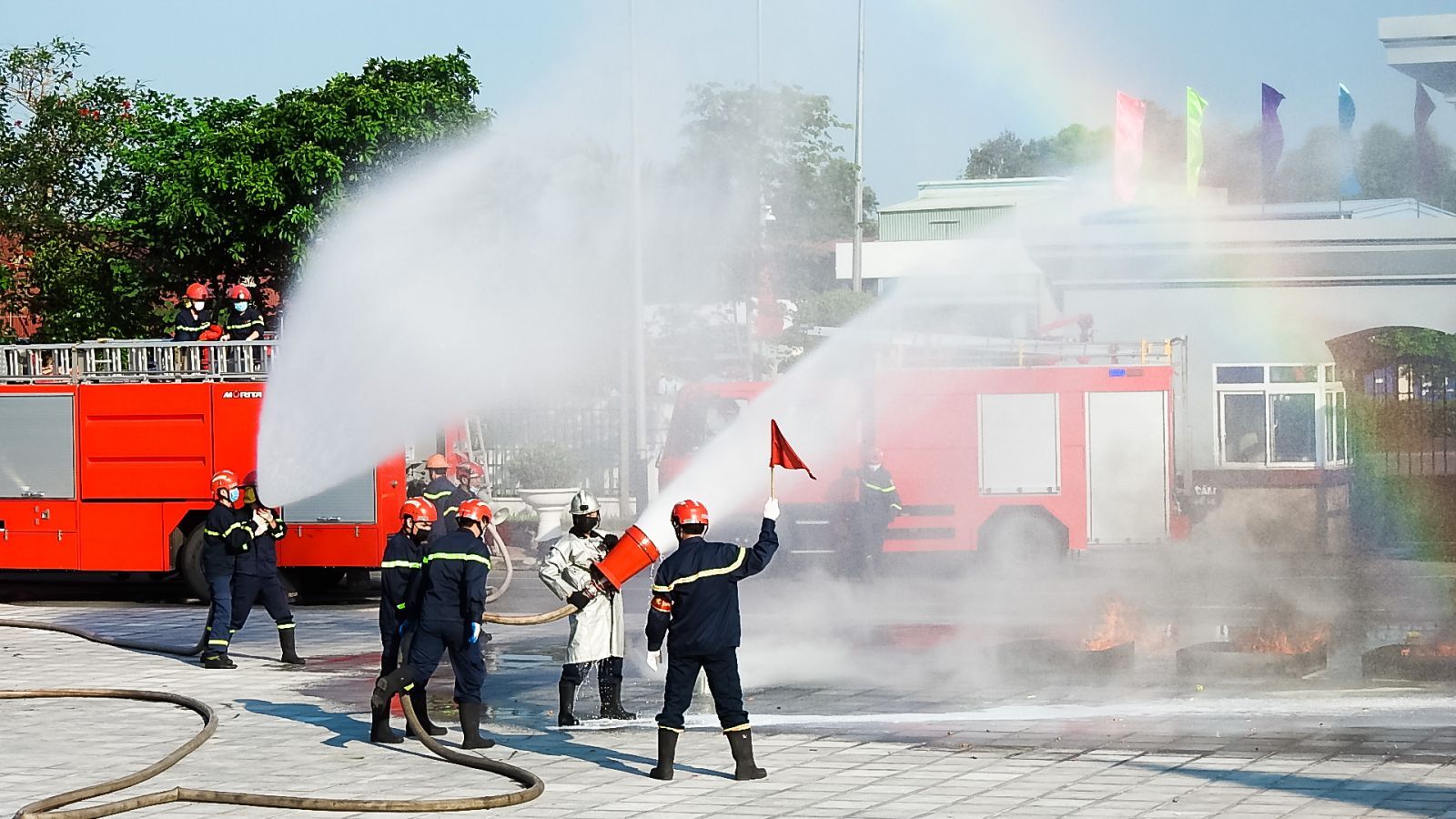 Nhiều xe chữa cháy hiện đại đồng loạt phun nước, nhanh chóng dập tắt đám cháy