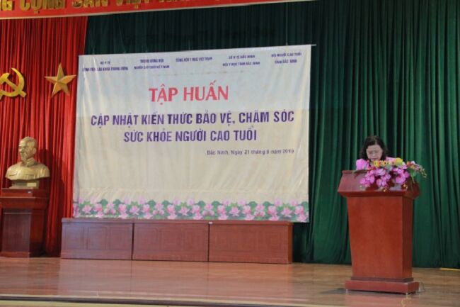 Dự lớp tập huấn có PGS.TS Nguyễn Thị Xuyên – Chủ tịch Hội Y học các nước Đông Nam Á, Chủ tịch Tổng hội Y học Việt Nam, nguyên Thứ trưởng Bộ Y tế; Bà Phạm Thị Hải Chuyền – Chủ tịch Trung ương Hội người Cao tuổi Việt Nam, Nguyên Ủy viên Ban Chấp hành Trung Ương Đảng Cộng sản Việt Nam, nguyên Bộ trưởng Bộ Lao động – Thương binh và xã hội; TS.BS Tô Thị Mai Hoa – TUV, Giám đốc Sở Y tế Bắc Ninh.