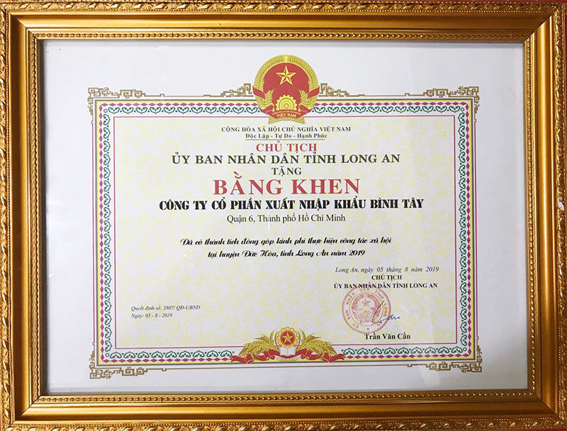Ngày 16/8 vừa qua, Chủ tịch UBND tỉnh Long An đã trao tặng Bằng khen cho tập thể Công ty CP Xuất nhập khẩu Bình Tây (BITEX) vì “Đã có thành tích đóng góp kinh phí thực hiện công tác xã hội tại huyện Đức Hòa, tỉnh Long An năm 2019”.