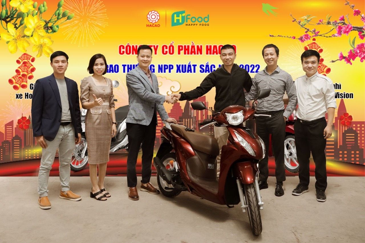 Triển khai từ giữa tháng 01/2023, Ban lãnh đạo Công ty Cổ phần HACAO tổ chức chương trình “Trao giải cho NPP có sản lượng tiêu thụ sản phẩm xuất sắc” đã trực tiếp trao tặng giải thưởng xe máy SH Mode và Honda Vision tại cơ sở các NPP có doanh số xuất sắc năm 2022.