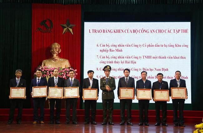 Ông Đoàn Quốc Kiên - PGĐ Công ty Điện lực Nam Định (thứ hai từ trái sang) nhận Bằng khen đơn vị dẫn đầu phong trào thi đua về phong trào bảo vệ an ninh Tổ quốc của Bộ Công an