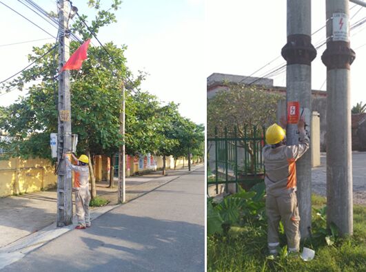 Công nhân Điện lực Nam Trực (Nam Định) thực hiện dán biển cảnh báo nguy hiểm