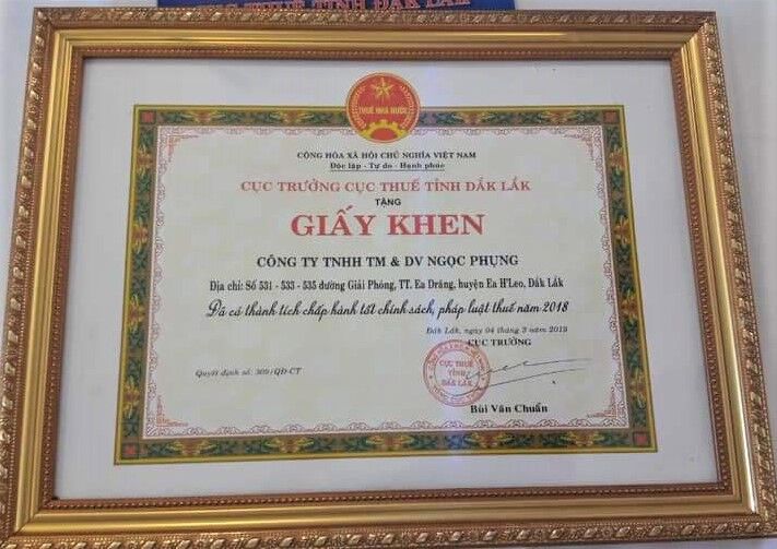 Một doanh nghiệp trong suốt 10 năm liền là doanh nghiệp tiêu biểu hàng đầu về nghành Thương mại và dịch vụ được UBND tỉnh, Cục Thuế Tỉnh, và UBND huyện trao tặng bằng khen giấy khen.
