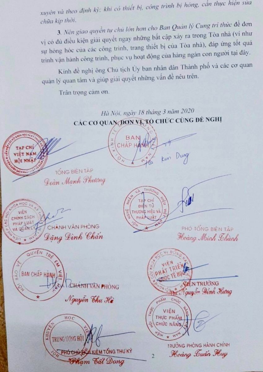 Nội dung đơn kiến nghị nêu rõ: Cung trí thức Thành phố Hà Nội là nơi làm việc của nhiều cơ quan, đơn vị, Tổ chức Chính trị - xã hội... của các tầng lớp trí thức Thủ đô. Từ nhiều năm qua, thông qua Ban Quản lý Cung, việc duy trì các hoạt động tại Cung trí thức được thực hiện tốt. Các cơ quan, đơn vị, tổ chức có trụ sở làm việc tại đây luôn chấp hành tốt nội quy, quy chế, giữ được trật tự và sự ổn định tại Cung trí thức.
