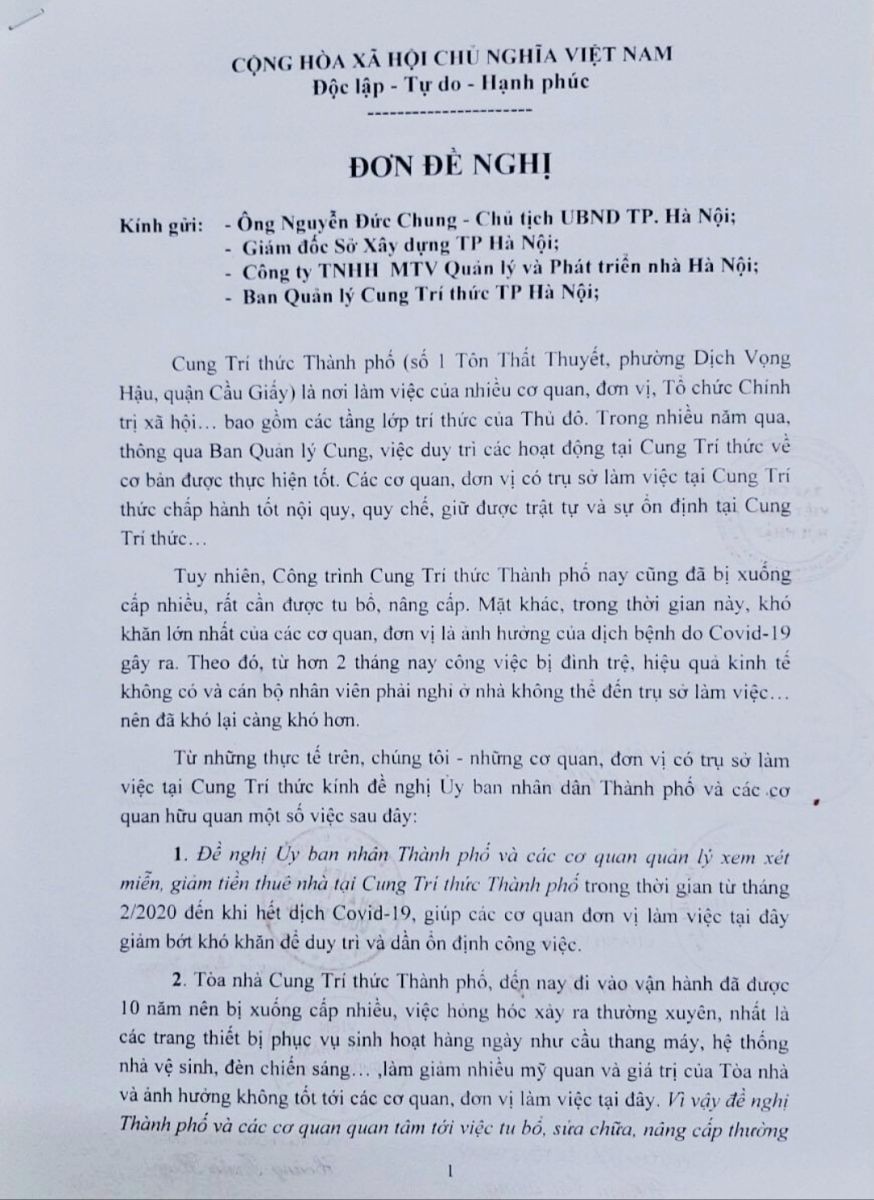 Đơn kiến nghị của các đơn vị có trụ sở tại Cung Trí Thức gửi Chủ tịch UBND Thành phố Hà Nội.