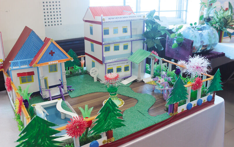 Kỹ thuật viên Vũ Thị Thanh Nhàn, khoa Chẩn đoán hình ảnh đưa tay giới thiệu từng chi tiết trên sản phẩm của khoa mình “Mô hình Bệnh viện Xanh của chúng tôi được làm từ toàn bộ rác thải hàng ngày của khoa như: Tấm nhựa trong phim X.quang, lõi giấy siêu âm, cùng với ống hút, chai nhựa, hộp sữa chua, thìa nhựa. Với cán bộ y tế, nơi đây gắn bó ít nhất 8 tiếng/ ngày, còn với bệnh nhân, đó là nơi họ sinh hoạt 24/24, do đó môi trường cần xanh, sạch, đẹp mới bảo đảm sức khỏe”.