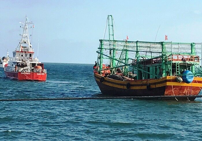 Tàu cứu nạn SAR 411 tiếp cận và đưa tàu cá QB 92701 TS về bờ. Ảnh: Vietnam MRCC