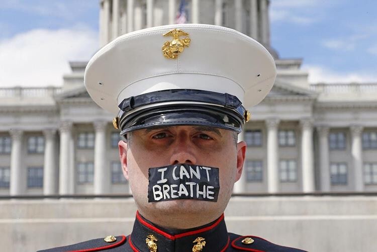 Winn mặc quân phục và đứng một mình trước Tòa nhà Quốc hội bang Utah tại thành phố Salt Lake hôm 5/6. Ông dán một miếng băng dính màu đen trên miệng ghi dòng chữ "Tôi không thể thở", khẩu hiệu của cuộc biểu tình chống phân biệt chủng tộc và tình trạng bạo lực của cảnh sát sau cái chết của George Floyd, người da màu bị cảnh sát ghì chết tại thành phố Minneapolis.