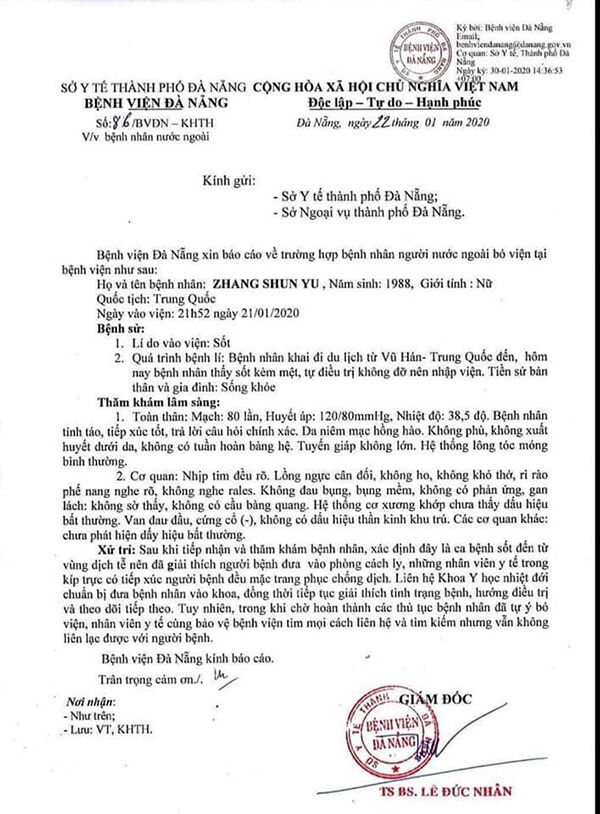 Cụ thể thông tin cho biết, ngày 21/01/2020, Bệnh viện Đà Nẵng tiếp nhận nữ bệnh nhân Zhang Shun Yu, quốc tịch Trung Quốc với tình trạng sốt kèm mệt, không ho, không khó thở. Xác định ca sốt này có liên quan đến vùng dịch tễ cần cảnh báo, các bác sĩ đã giải thích và đưa bệnh nhân vào phòng cách ly để theo dõi, mọi tiếp xúc đều tuân thủ những quy định phòng dịch. Do đang đi du lịch và đã có vé khứ hồi, nên bệnh nhân đã tự ý bỏ bệnh viện, quay về Trung Quốc qua sân bay Trịnh Châu vào chiều 22/01/2020. Tình trạng sức khỏe của bệnh nhân lúc đó không sốt.