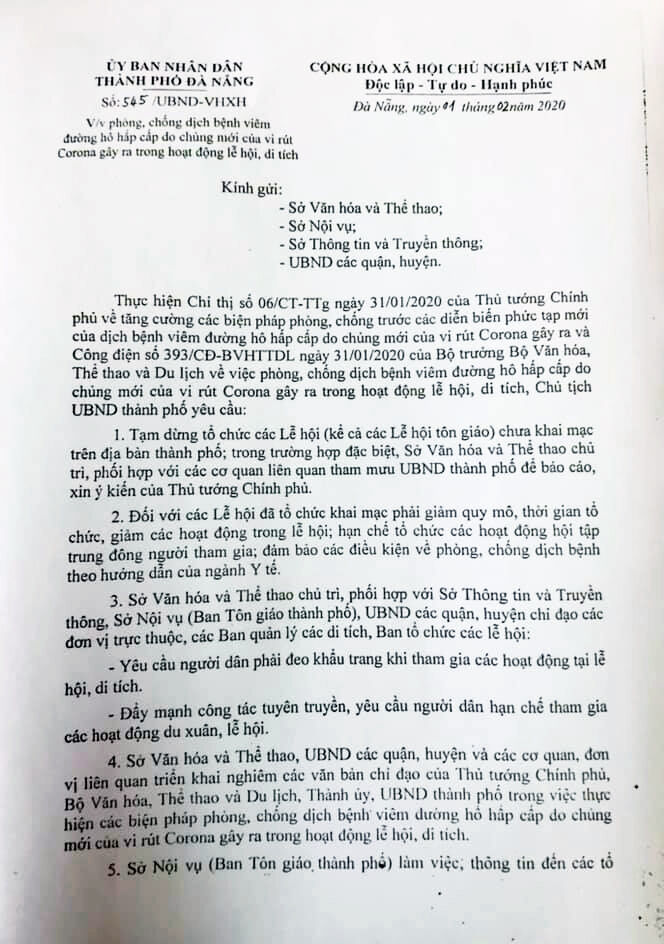 VNHN - Chính quyền thành phố Đà Nẵng vừa có công văn 545 (ngày 01/02/2020) yêu cầu sở Văn hóa Thể thao phối hợp các đơn vị, ban ngành tạm dừng tất cả hoạt động lễ hội chưa khai mạc, kể cả các lễ hội tôn giáo trên địa bàn thành phố Đà Nẵng, nhằm chủ động hạn chế nguy cơ lây lan dịch bệnh hô hấp cấp.